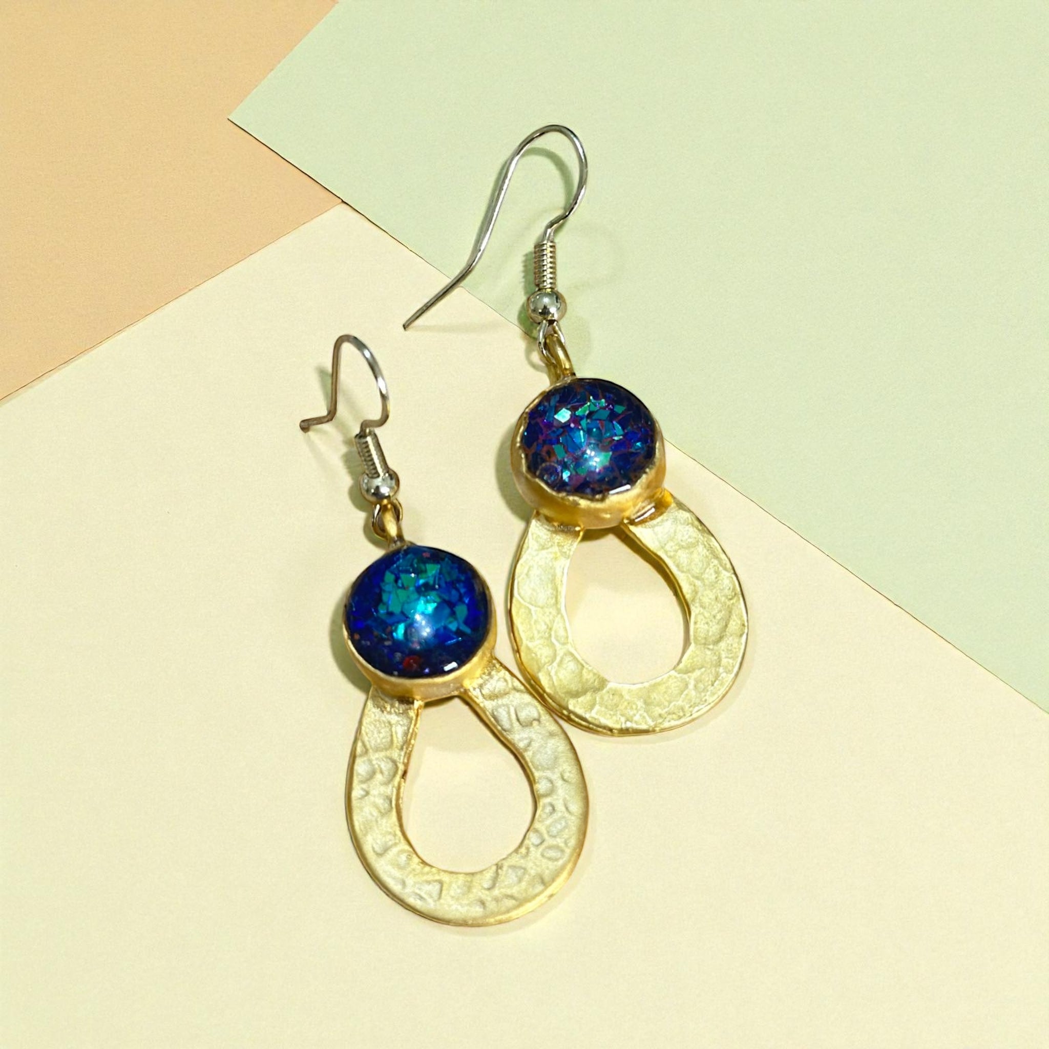 Gold coloured metal earrings with sapphire blue glitter resin detail.