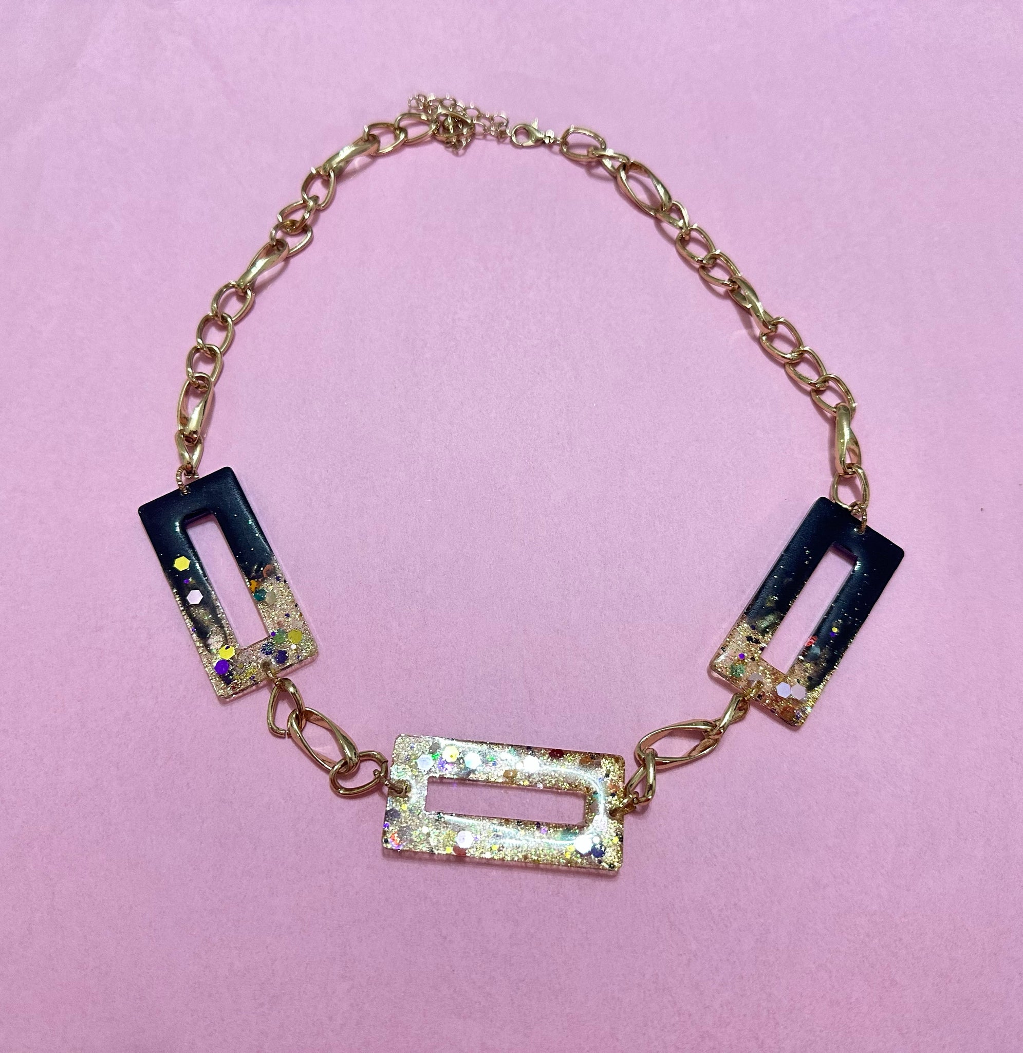 Resin and glitter filled statement piece necklace set on thick gold coloured lightweight chain.